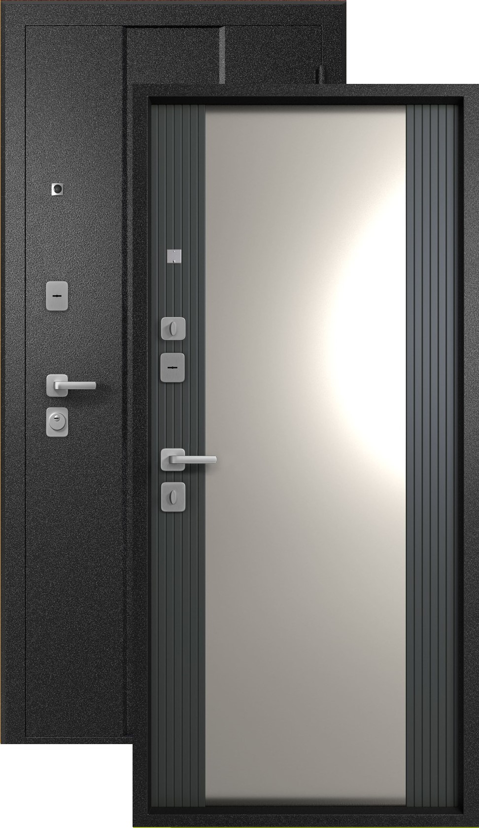Повышенной надежности российская дверь с большим зеркалом на внутренней панели. Прекрасно подойдет для установки в квартиру. Солидная модель, которая хорошо защитит и подчеркнет статус.