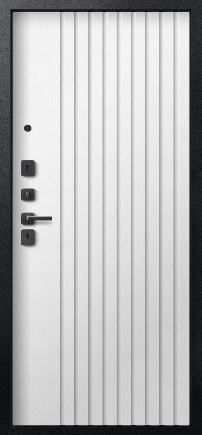Повышенной надежности российская дверь со стильной внешней отделкой муар черный/бетон темный и красивой декоративной панелью толщиной 8 в цвете софт ясень белый. Прекрасно подойдет для установки в квартиру. Солидная модель, которая хорошо защитит и подчеркнет статус.