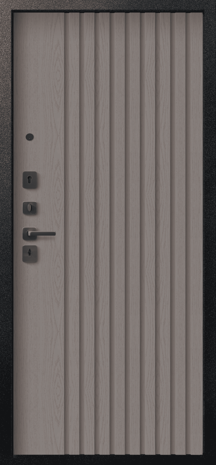 Повышенной надежности российская дверь со стильной внешней отделкой муар черный/бетон темный и красивой декоративной панелью толщиной 8 в цвете софт ясень грей. Прекрасно подойдет для установки в квартиру. Солидная модель, которая хорошо защитит и подчеркнет статус.