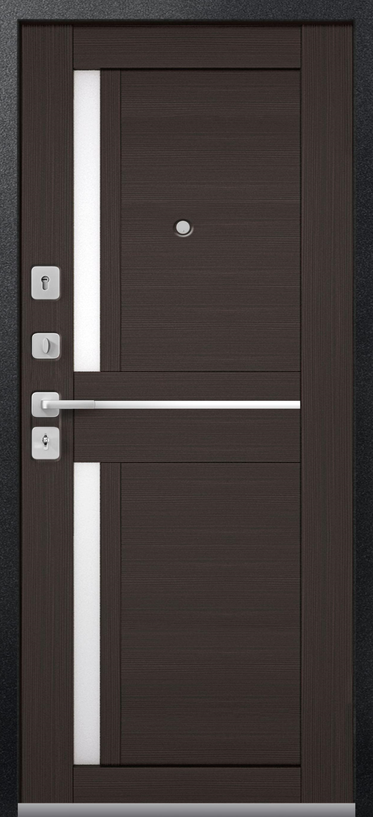 Дверь имеет хорошую прочность из-за толщины металла 1,4 мм. Оснащена двумя надежными замками, минимум один из которых имеет высший класс взломостойкости по ГОСТ 5089-2003 (4 класс). Есть врезная броненакладка, защищающая цилиндровый замок от высверливания. Она утоплена в дверное полотно, поэтому ее практически невозможно сбить. Есть ночная задвижка — дополнительная защита от взлома. Никто не сможет зайти, вскрыв замок, когда вы дома.