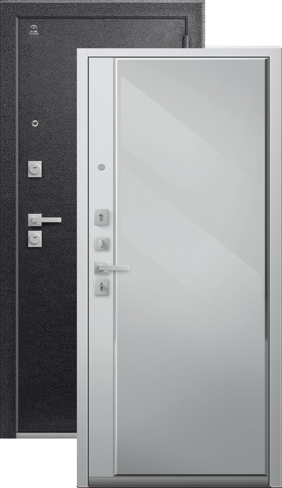 Повышенной надежности российская сейф-дверь с большим зеркалом на внутренней панели со стильной внешней отделкой муар черный. Прекрасно подойдет для установки в квартиру. Солидная модель, которая хорошо защитит и подчеркнет статус.