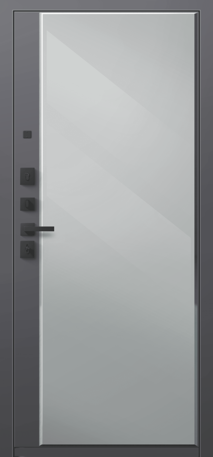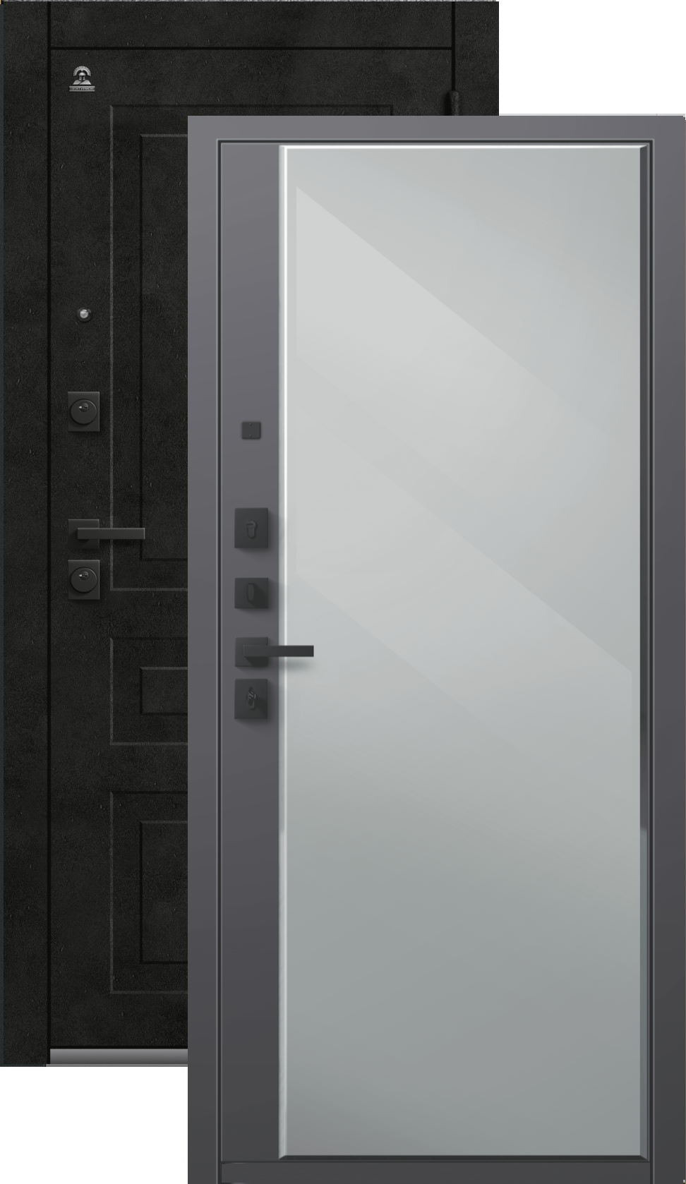 Повышенной надежности российская сейф-дверь с большим зеркалом на внутренней панели со стильной внешней отделкой муар черный/бетон темный. Прекрасно подойдет для установки в квартиру. Солидная модель, которая хорошо защитит и подчеркнет статус.